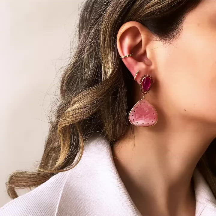 Handmade from 18k yellow gold with ruby, garnet and carved opal.